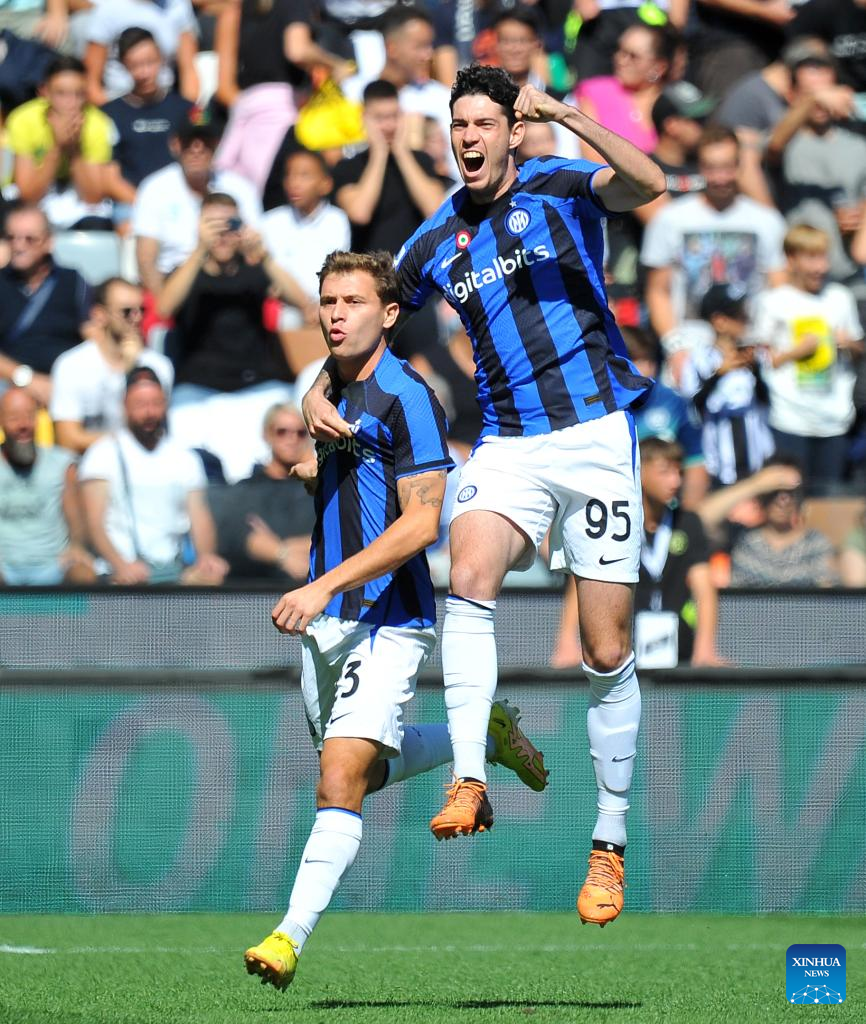 FC Inter's Nicolo Barella (L) celebrates scoring with his teammate Alessandro Bastoni during a Serie A soccer match between Udinese and FC Inter in Udine, Italy, on Sept. 18, 2022. (Str/Xinhua)