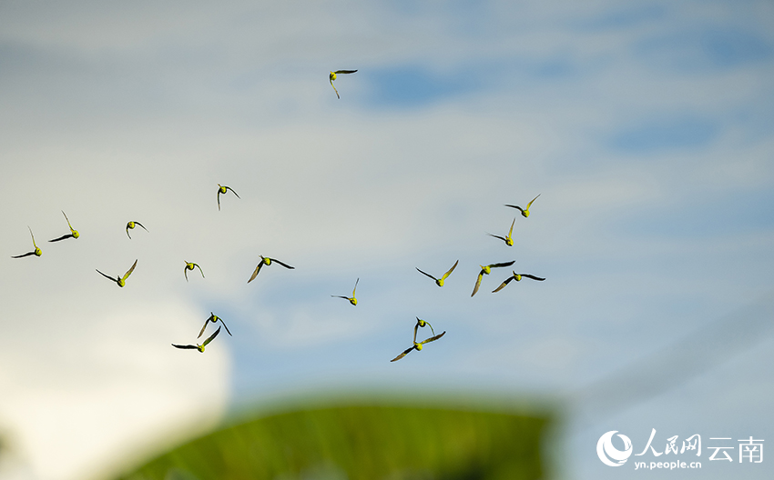 Eighteen blossom-headed parakeets fly in the sky. (Photo/Zhu Bianyong)