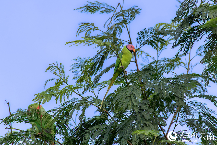 A blossom-headed parakeet and an Alexandrine parakeet perch on tree branches. (Photo/Hu Xiaohong)