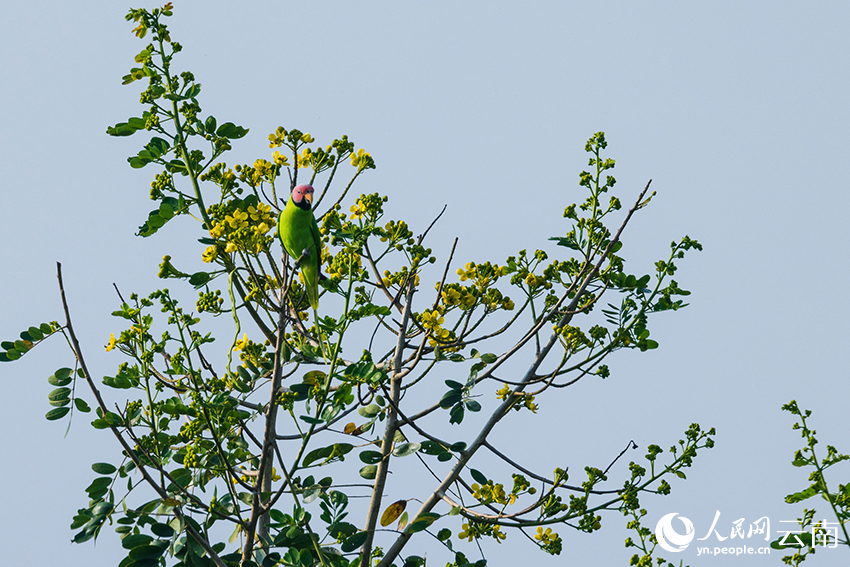 A male blossom-headed parakeet perches on a tree branch. (Photo/Jia Lei)