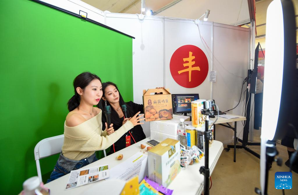 A live-streamer introduces an activity celebrating the upcoming Chinese farmers' harvest festival in Hohhot, north China's Inner Mongolia Autonomous Region, Sept. 19, 2022. Initiated in 2018, the Chinese farmers' harvest festival coincides with the autumnal equinox each year, which is one of the 24 solar terms of the Chinese lunar calendar and usually falls between Sept. 22 and 24 during the country's agricultural harvest season. (Xinhua/Peng Yuan)