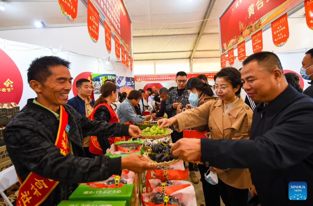 Visitors taste grapes during an activity celebrating the upcoming Chinese farmers' harvest festival in Hohhot, north China's Inner Mongolia Autonomous Region, Sept. 19, 2022. Initiated in 2018, the Chinese farmers' harvest festival coincides with the autumnal equinox each year, which is one of the 24 solar terms of the Chinese lunar calendar and usually falls between Sept. 22 and 24 during the country's agricultural harvest season. (Xinhua/Peng Yuan)