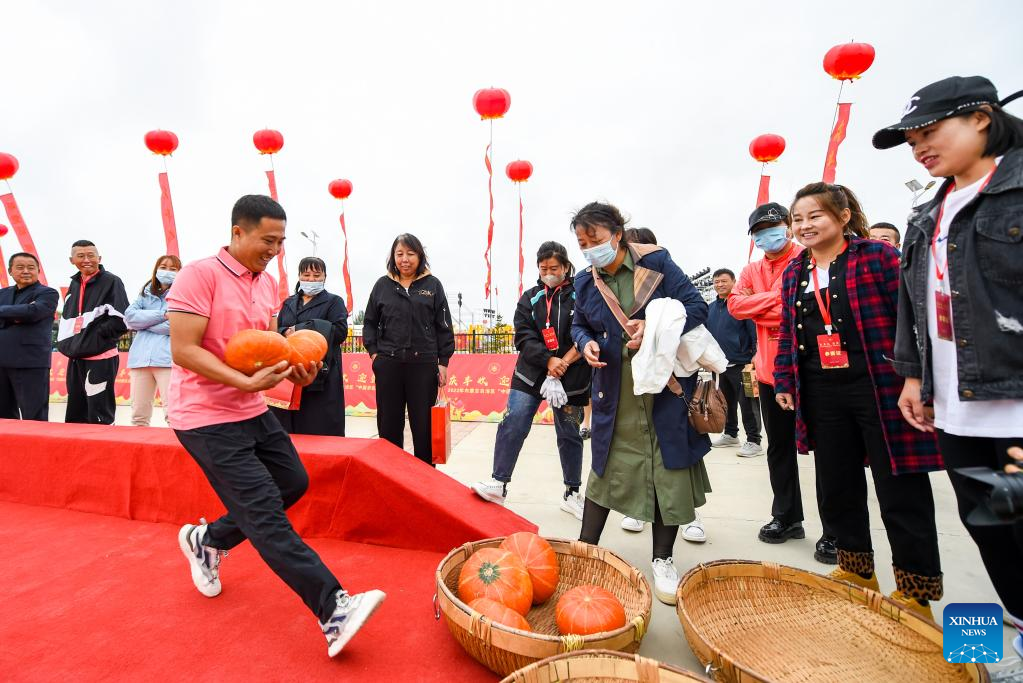 People take part in a game to celebrate the upcoming Chinese farmers' harvest festival in Hohhot, north China's Inner Mongolia Autonomous Region, Sept. 19, 2022. Initiated in 2018, the Chinese farmers' harvest festival coincides with the autumnal equinox each year, which is one of the 24 solar terms of the Chinese lunar calendar and usually falls between Sept. 22 and 24 during the country's agricultural harvest season. (Xinhua/Peng Yuan)
