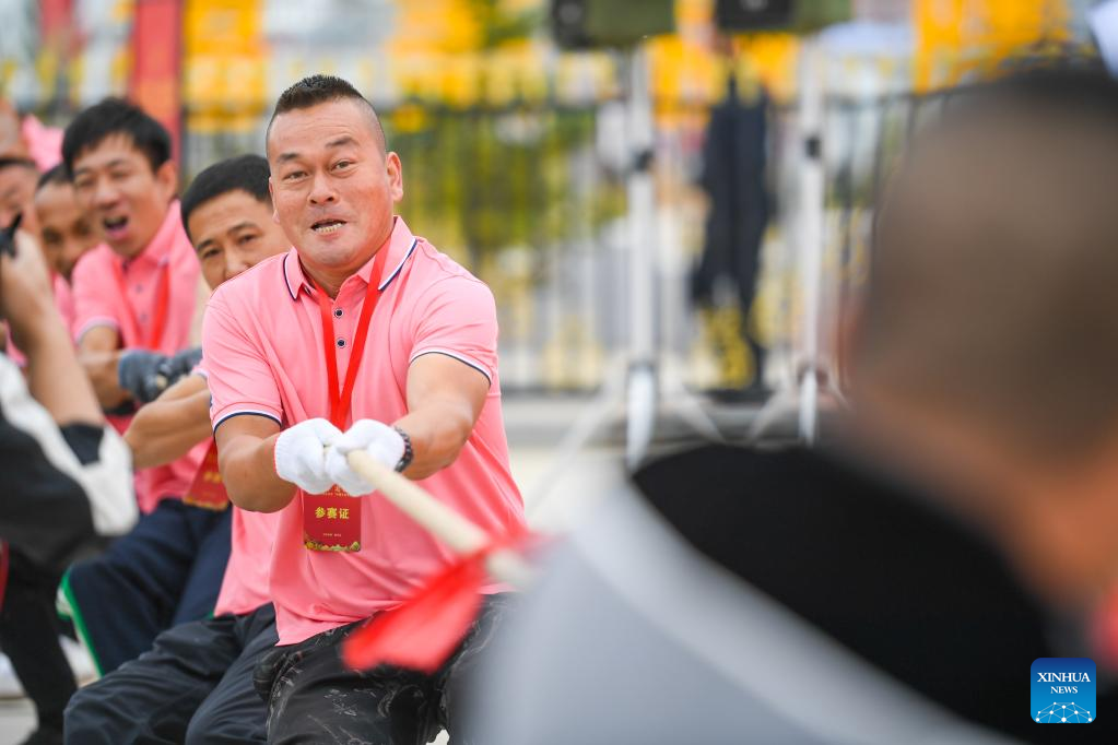 People take part in a tug-of-war game to celebrate the upcoming Chinese farmers' harvest festival in Hohhot, north China's Inner Mongolia Autonomous Region, Sept. 19, 2022. Initiated in 2018, the Chinese farmers' harvest festival coincides with the autumnal equinox each year, which is one of the 24 solar terms of the Chinese lunar calendar and usually falls between Sept. 22 and 24 during the country's agricultural harvest season. (Xinhua/Peng Yuan)