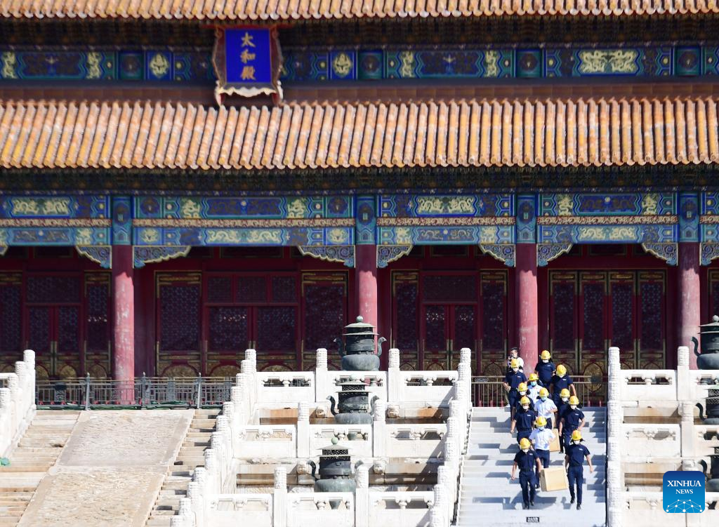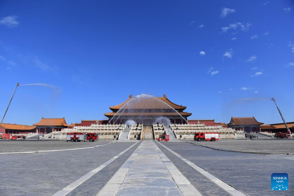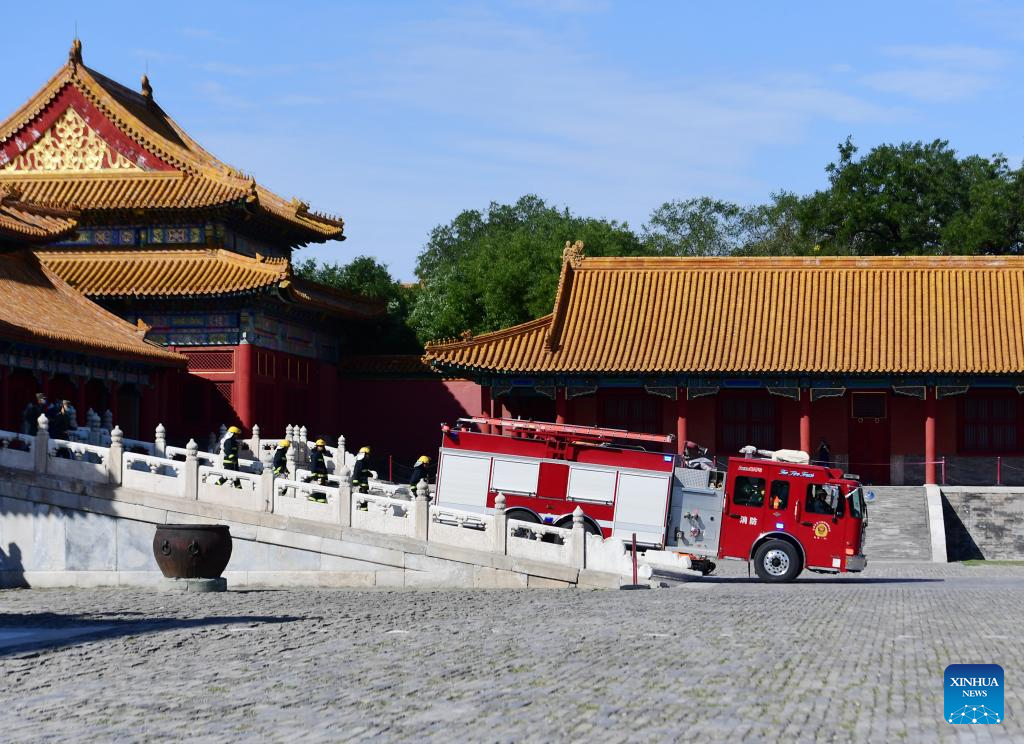 Photo taken on Sept. 19, 2022 shows a fire drill taking place at the Palace Museum, also known as the Forbidden City, in Beijing, capital of China.