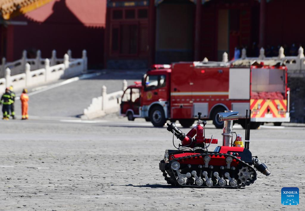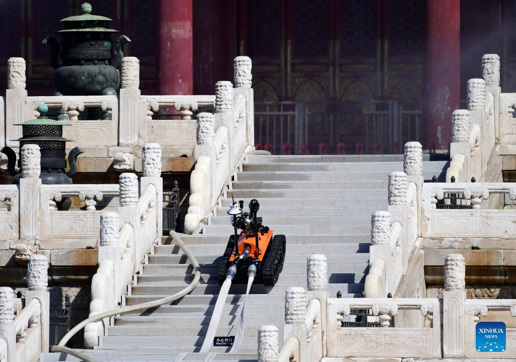 A fire fighting robot is seen during the fire drill held in the Palace Museum, also known as the Forbidden City, in Beijing, capital of China, Sept. 19, 2022.