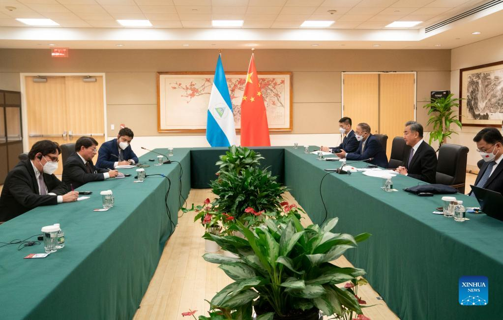 Chinese State Councilor and Foreign Minister Wang Yi (2nd R) meets with Nicaraguan Foreign Minister Denis Moncada (2nd L) in New York, the United States, on Sept. 19, 2022. (Xinhua/Liu Jie)