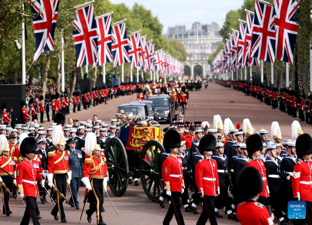 The cortege with the hearse carrying the coffin of Queen Elizabeth II travels on a road near the Buckingham Palace in London, Britain, Sept. 19, 2022. (Xinhua/Li Ying)