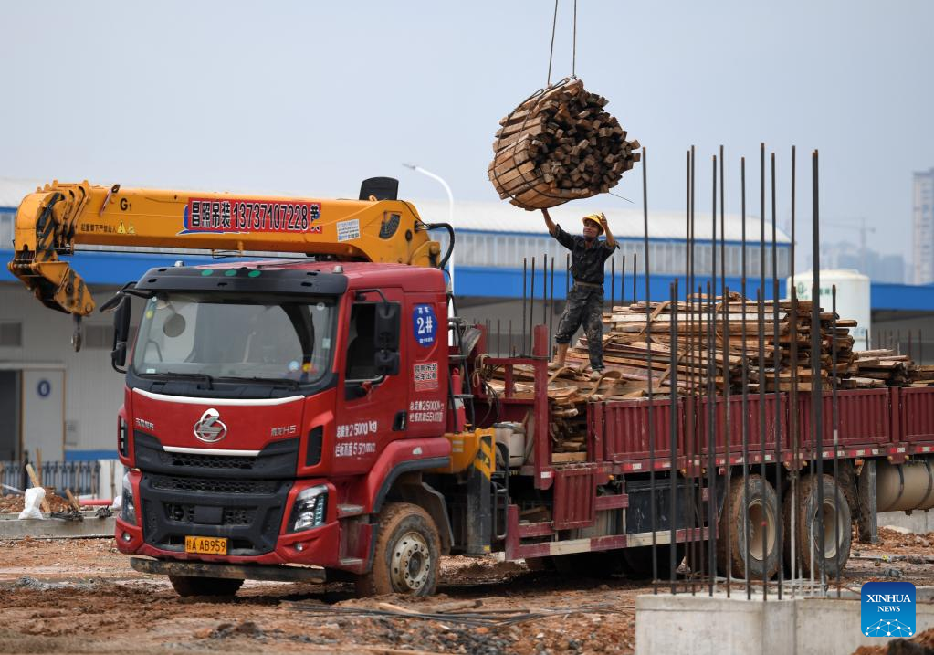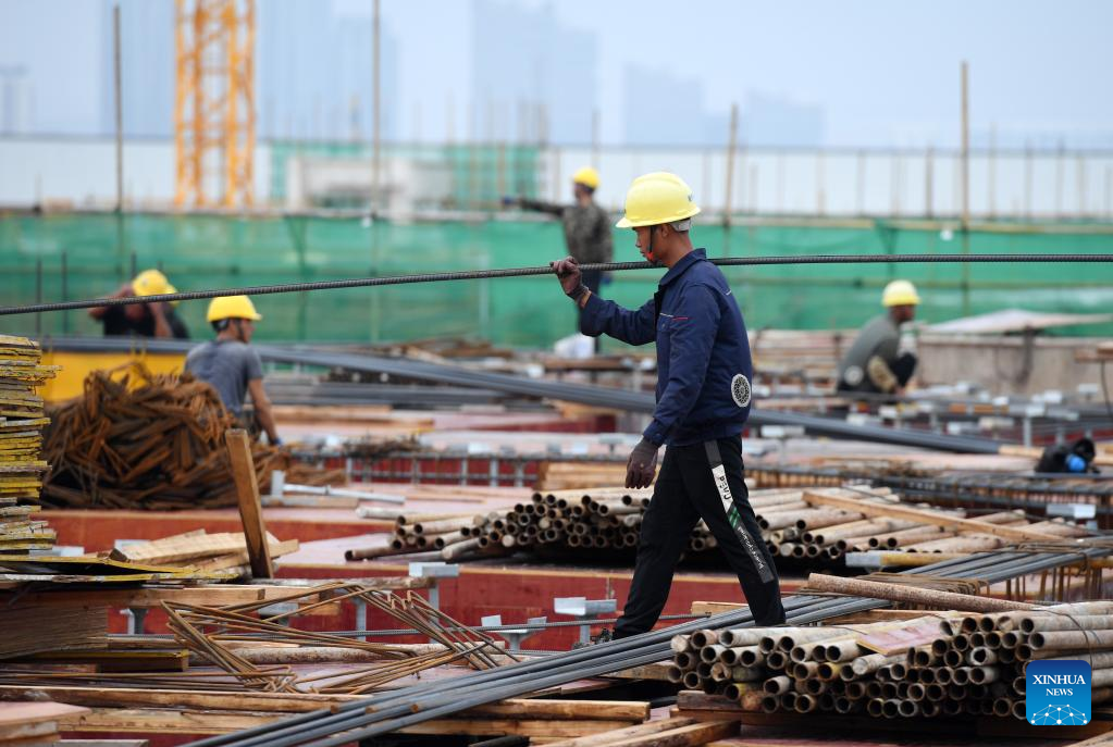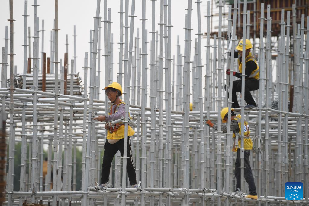 Workers work at the construction site of an e-commerce logistics zone project in the Nanning International Railway Port in Nanning, capital of south China's Guangxi Zhuang Autonomous Region, Sept. 20, 2022. (Xinhua/Lu Boan)