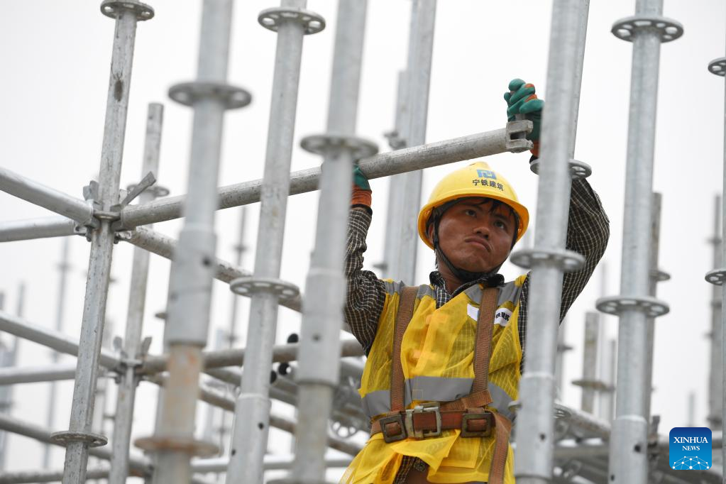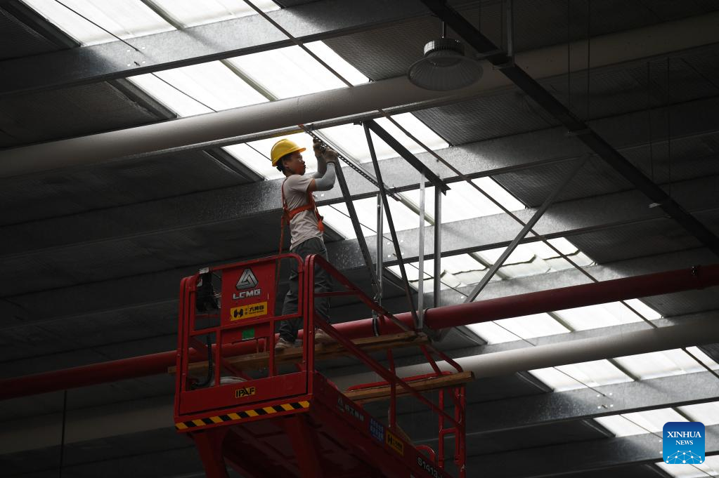 A worker works at the construction site of an e-commerce logistics zone project in the Nanning International Railway Port in Nanning, capital of south China's Guangxi Zhuang Autonomous Region, Sept. 20, 2022. (Xinhua/Lu Boan)