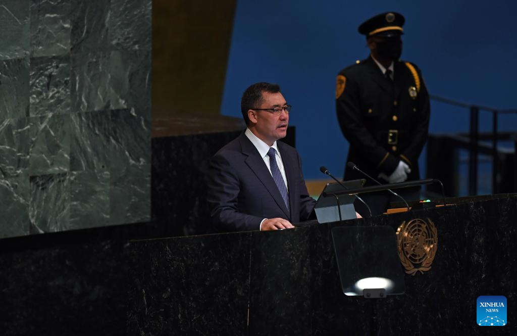 Kyrgyz President Sadyr Zhaparov speaks during the General Debate of the 77th session of the UN General Assembly at the UN headquarters in New York, on Sept. 20, 2022. The General Debate of the 77th session of the UN General Assembly opened on Tuesday with the theme of "A watershed moment: transformative solutions to interlocking challenges." (Xinhua/Li Rui)