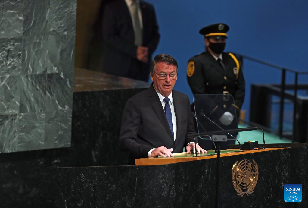 Brazilian President Jair Bolsonaro speaks during the General Debate of the 77th session of the UN General Assembly at the UN headquarters in New York, on Sept. 20, 2022. The General Debate of the 77th session of the UN General Assembly opened on Tuesday with the theme of "A watershed moment: transformative solutions to interlocking challenges." (Xinhua/Li Rui)