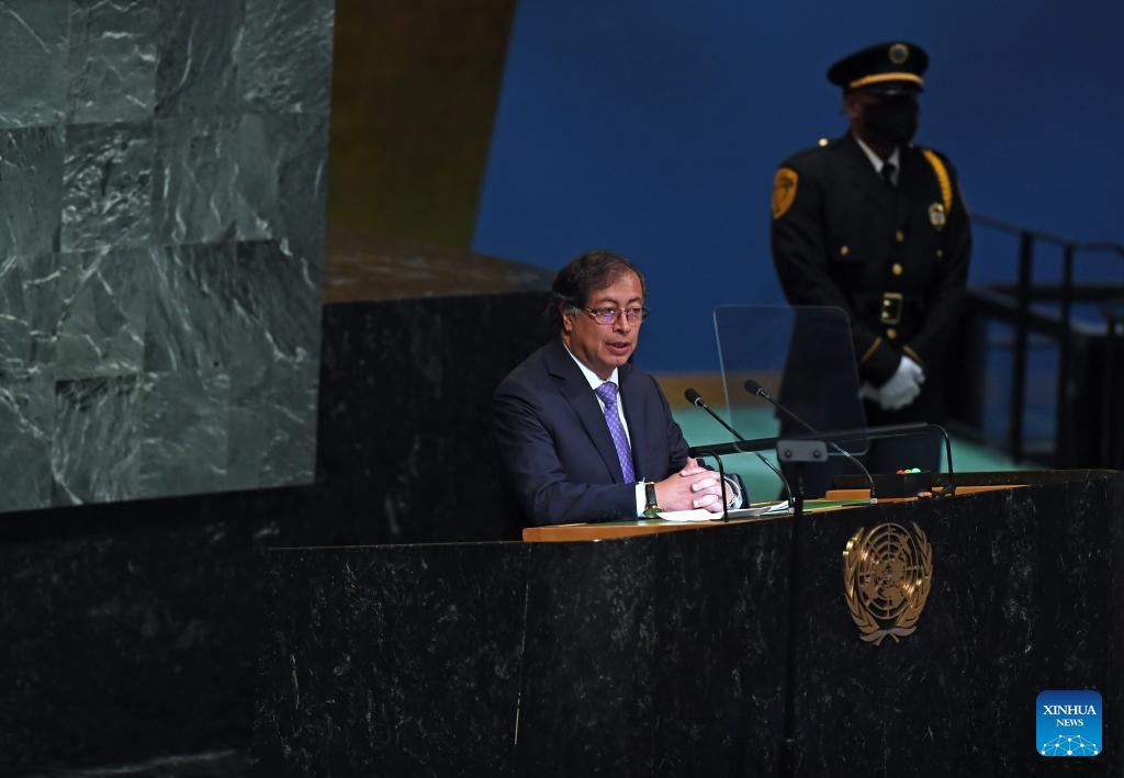 Colombian President Gustavo Petro speaks during the General Debate of the 77th session of the UN General Assembly at the UN headquarters in New York, on Sept. 20, 2022. The General Debate of the 77th session of the UN General Assembly opened on Tuesday with the theme of "A watershed moment: transformative solutions to interlocking challenges." (Xinhua/Li Rui)