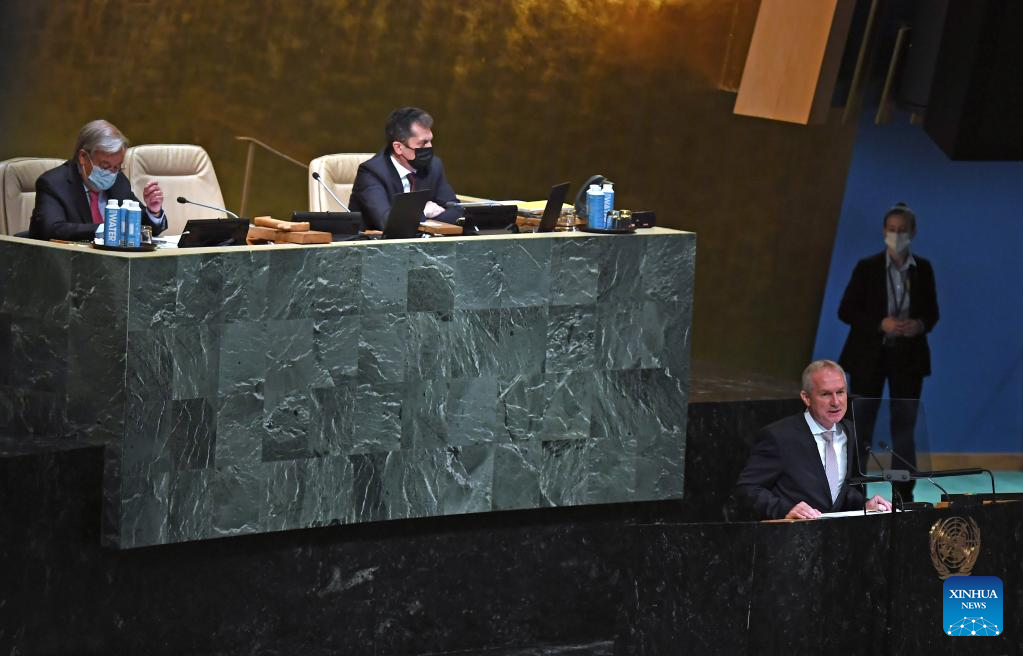 Csaba Korosi (front), president of the 77th session of the UN General Assembly, speaks at the opening of the General Debate of the 77th session of the UN General Assembly at the UN headquarters in New York, Sept. 20, 2022.