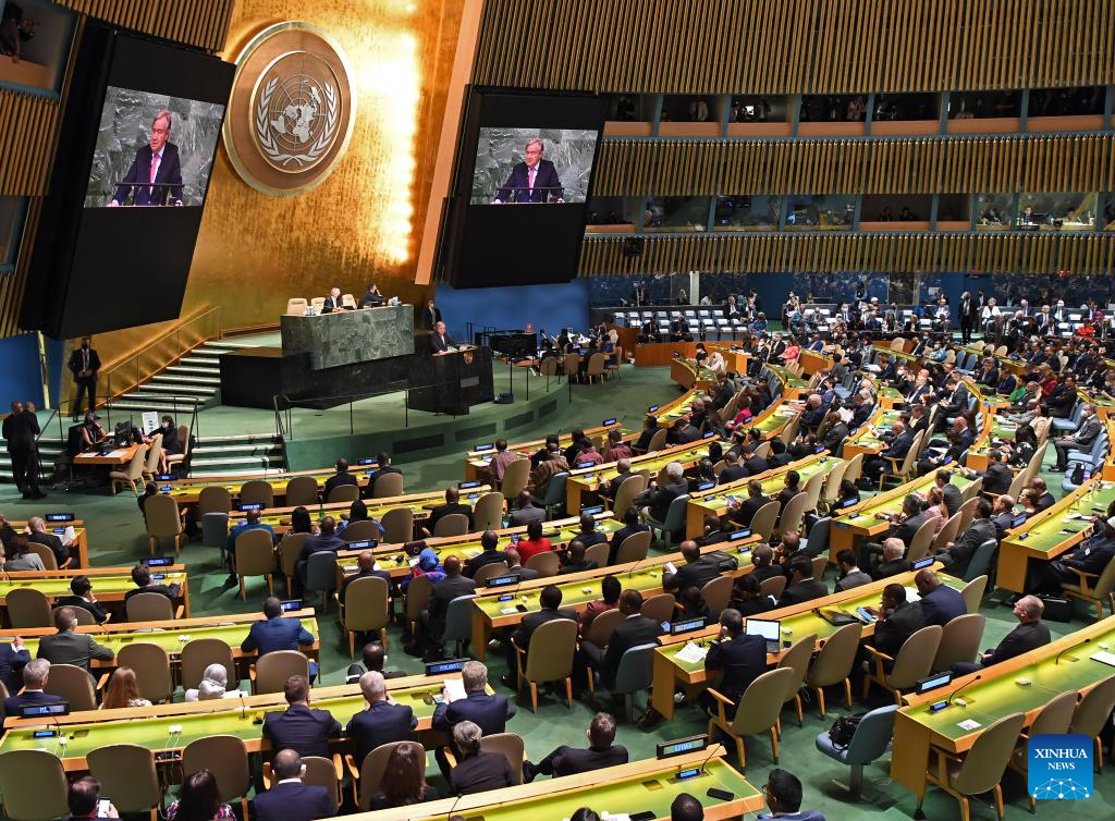 UN Secretary-General Antonio Guterres (at the podium and on the screens) speaks during the opening of the General Debate of the 77th session of the UN General Assembly at the UN headquarters in New York, Sept. 20, 2022. The General Debate of the 77th session of the UN General Assembly opened on Tuesday with the theme of "A watershed moment: transformative solutions to interlocking challenges." (Xinhua/Li Rui)