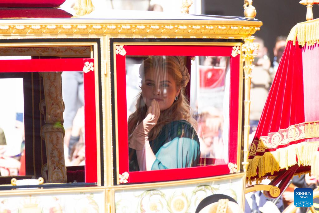 Princess Amalia of the Netherlands ride in the Glass Coach in the Hague, the Netherlands, on the Prince's Day, Sept. 20, 2022. The third Tuesday in September is Prince's Day in the Netherlands. It marks the opening of the Dutch parliamentary season, and on this day the reigning monarch outlines the government's plans for the year ahead. (Photo by Sylvia Lederer/Xinhua)
