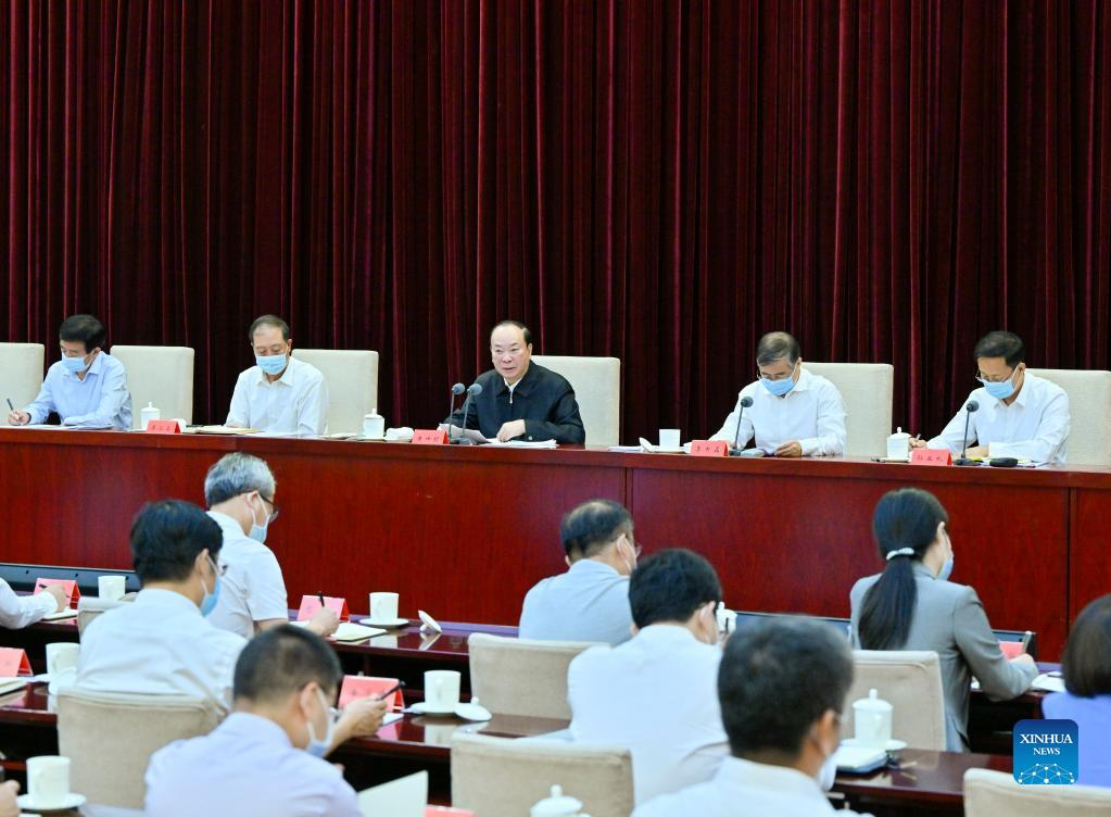Huang Kunming, a member of the Political Bureau of the Communist Party of China (CPC) Central Committee and head of the Publicity Department of the CPC Central Committee, addresses a convention of the Chinese Society of Ideological and Political Work in Beijing, capital of China, Sept. 20, 2022. (Xinhua/Gao Jie)