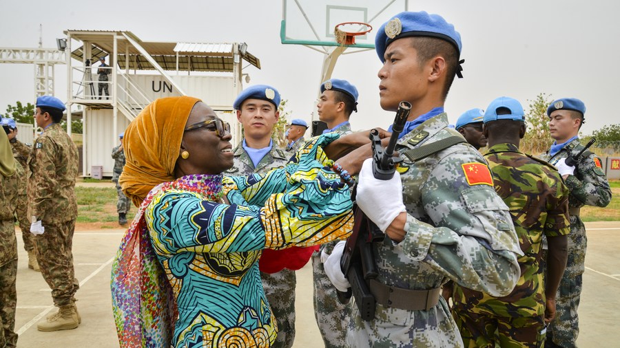 Anita Kiki Gebe, deputy joint special representative of the United Nations-African Union Mission in Darfur (UNAMID), awards UN peace medal to a soldier of the 2nd China Medium Utility Helicopter Unit (CMUHU02) in El-Fashir, Sudan, July 17, 2019. [Photo/Xinhua]