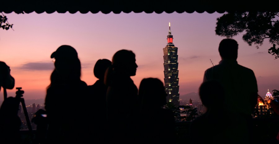 Tourists view the Taipei 101 skyscraper, a landmark in Taipei, Southeast China's Taiwan, Jan 2, 2017. [Photo/Xinhua]