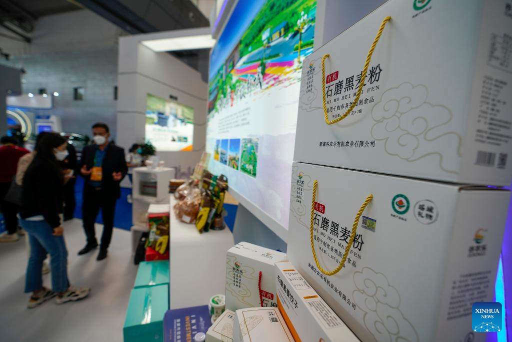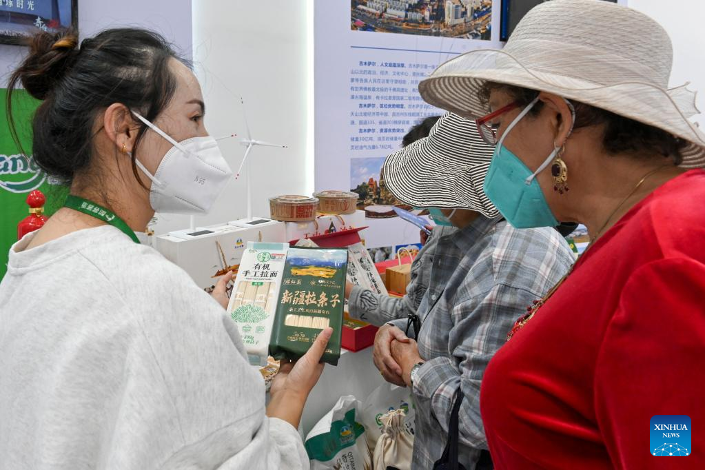 Visitors learn about food products at the seventh China-Eurasia Expo in Urumqi, northwest China's Xinjiang Uygur Autonomous Region, Sept. 21, 2022.