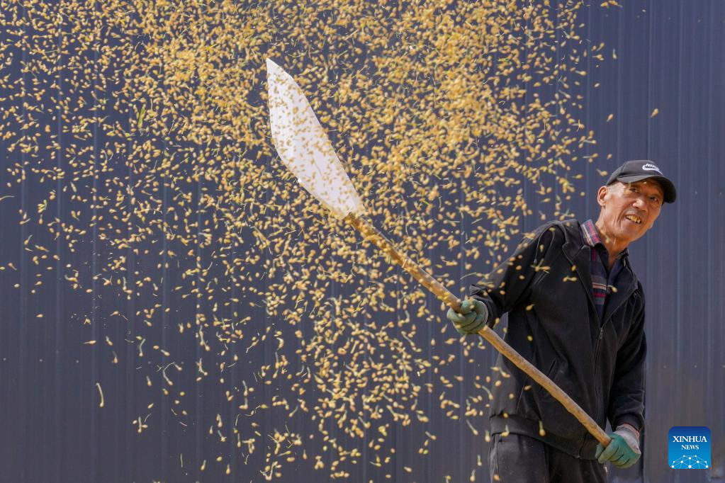 A farmer scatters the rice for screening at a family farm in Jiutai District of Changchun, northeast China's Jilin Province, Sept. 20, 2022. Autumn harvest has recently started at the rice-growing areas across the province. (Xinhua/Zhang Nan)