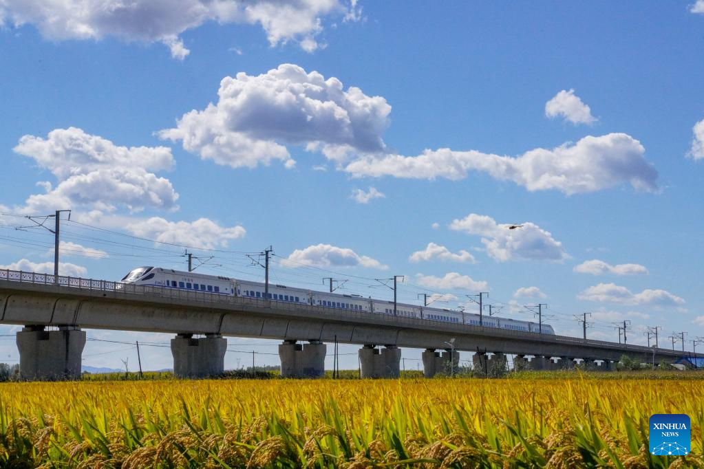 A bullet train runs along a paddy field in Fangshengangzi Village of Gongzhuling, northeast China's Jilin Province, Sept. 19, 2022. Autumn harvest has recently started at the rice-growing areas across the province. (Xinhua/Yan Linyun)