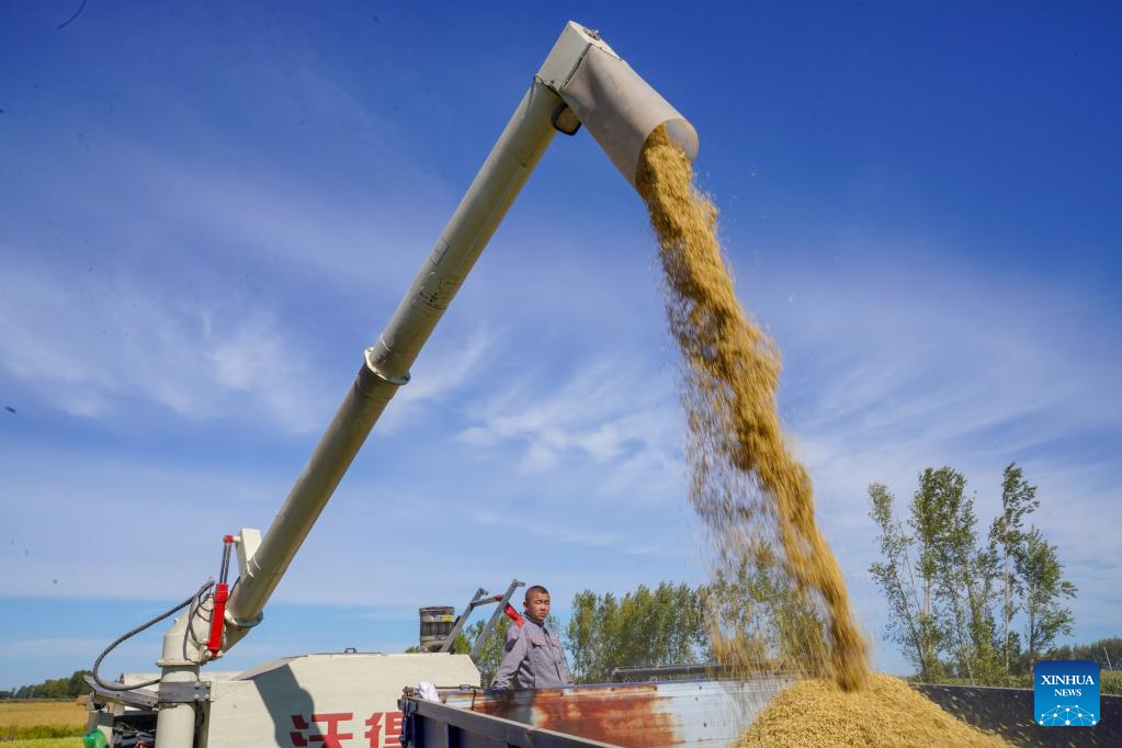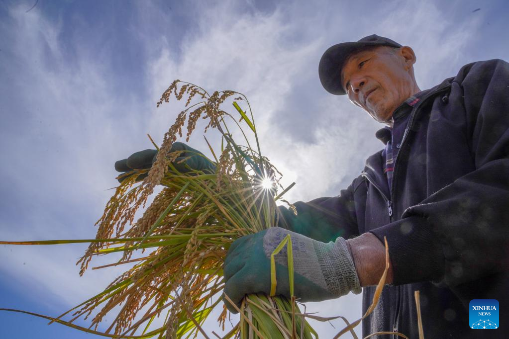 A farmer checks the harvested rice at a family farm in Jiutai District of Changchun, northeast China's Jilin Province, Sept. 20, 2022. Autumn harvest has recently started at the rice-growing areas across the province. (Xinhua/Zhang Nan)