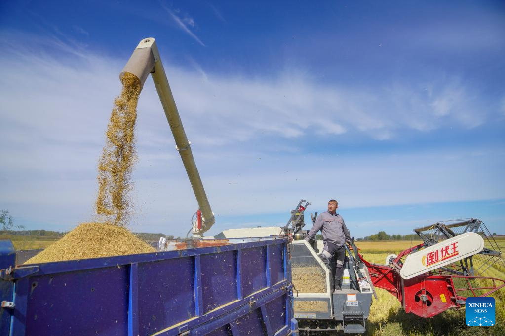 A farmer drives a farming machinery to harvest rice at a family farm in Jiutai District of Changchun, northeast China's Jilin Province, Sept. 20, 2022. Autumn harvest has recently started at the rice-growing areas across the province. (Xinhua/Yan Linyun)
