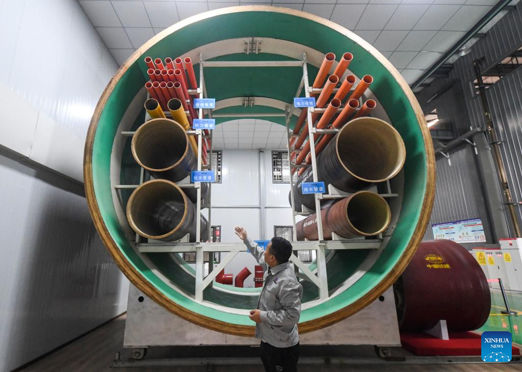 A staff member introduces products at a bamboo winding composite pipe (BWCP) production base of China Railway Construction Corporation Limited (CRCC) in Beibei District of southwest China's Chongqing, Sept. 20, 2022. In January 2021, a BWCP production base of CRCC went into operation in Beibei District of southwest China's Chongqing.