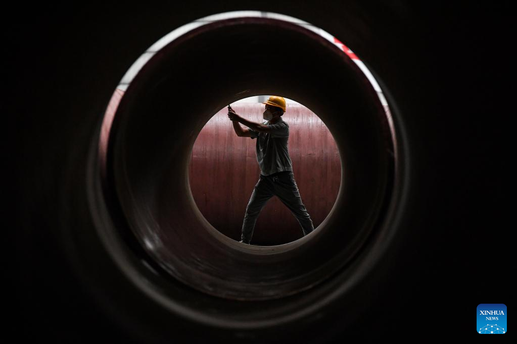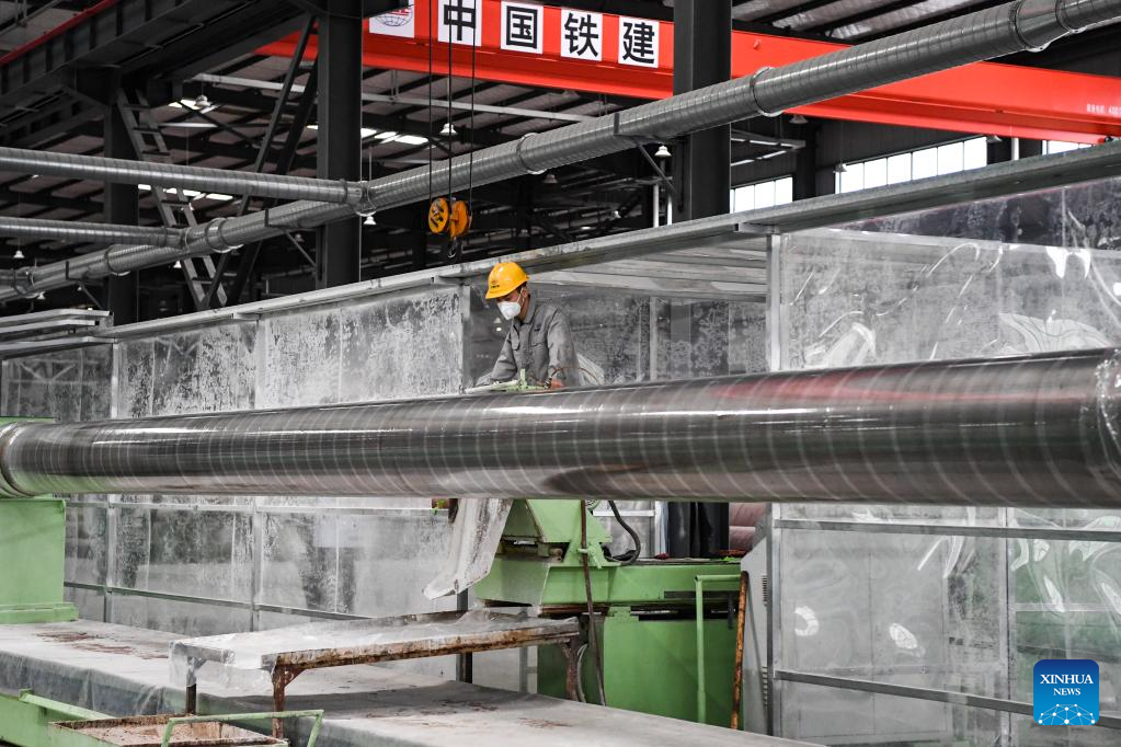 A worker works at a bamboo winding composite pipe (BWCP) production base of China Railway Construction Corporation Limited (CRCC) in Beibei District of southwest China's Chongqing, Sept. 20, 2022. In January 2021, a BWCP production base of CRCC went into operation in Beibei District of southwest China's Chongqing.