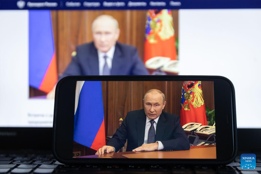 Photo taken in Moscow, Russia on Sept. 21, 2022 shows screens displaying Russian President Vladimir Putin speaking in a televised address. Putin signed a decree on the partial mobilization in Russia, the Kremlin said Wednesday, which the president said in a televised address that a partial mobilization is necessary to defend Russia's sovereignty and territorial integrity. (Xinhua/Bai Xueqi)