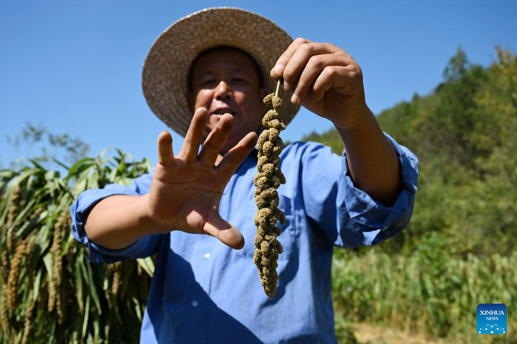 A villager demonstrates millet crops in Nihe Village of Luozhuangzi Township, Jizhou District, north China's Tianjin, Sept. 21, 2022. Nihe Village has increased residents' incomes by promoting ecological organic millet planting in recent years. Cooperatives are set up to take charge of planting, procurement, packaging and sales of millets. (Xinhua/Zhao Zishuo)