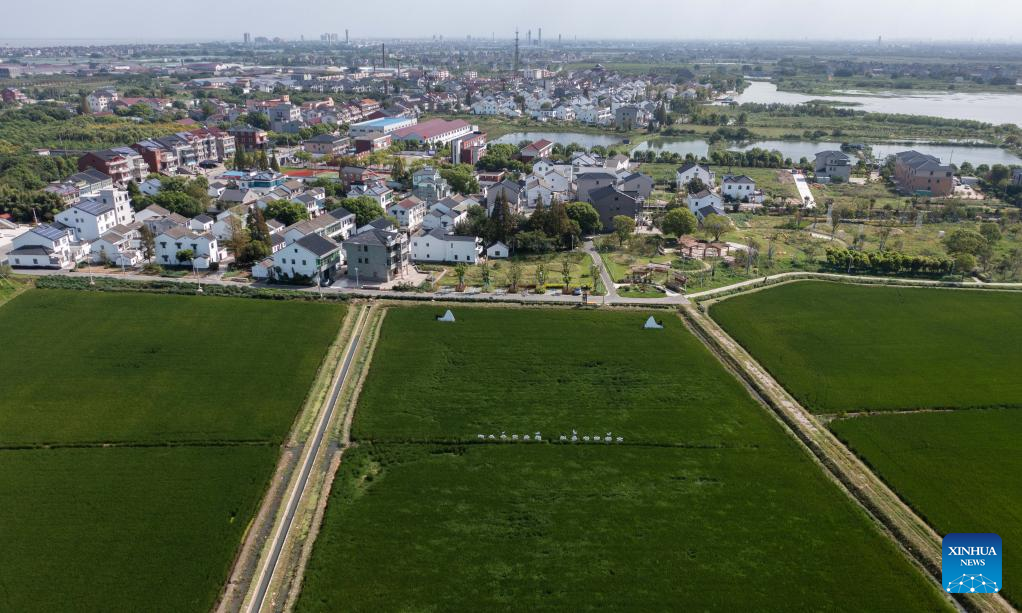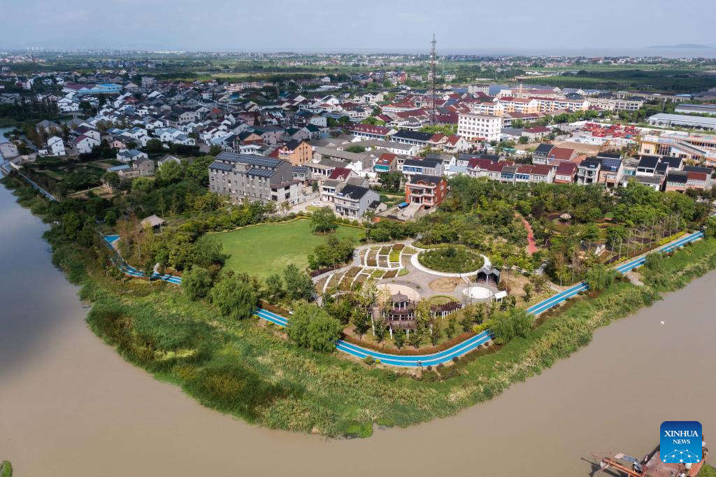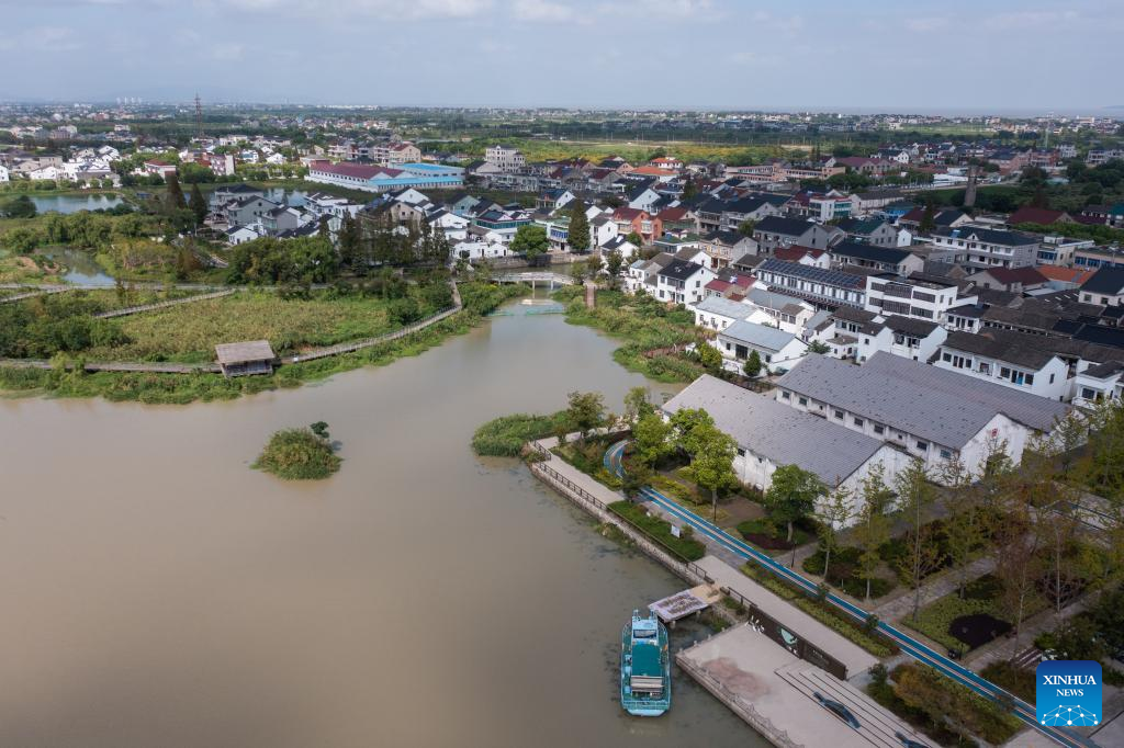 Aerial photo taken on Sept. 20, 2022 shows a view of Lujiawan Village in Zhili Town, Huzhou City, east China's Zhejiang Province. In recent years, once unused pools and lands in Zhili Town are transformed to parks and greenways to upgrade the village's ecological environment. (Xinhua/Xu Yu)
