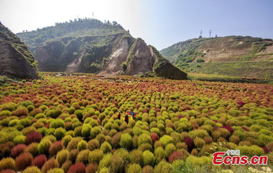 Farmers are busy harvesting the Kochia scoparia, or red broom grass, in Caojiagou village of Liulin county, north China's Shanxi Province. The broom grass turns to bright red color in autumn and can be used to make brooms after it is dried. (Photo: China News Service/Wang Fengyun)