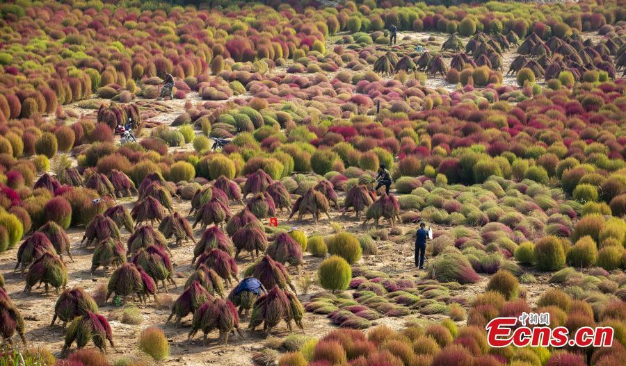 Farmers are busy harvesting the Kochia scoparia, or red broom grass, in Caojiagou village of Liulin county, north China's Shanxi Province. The broom grass turns to bright red color in autumn and can be used to make brooms after it is dried. (Photo: China News Service/Wang Fengyun)
