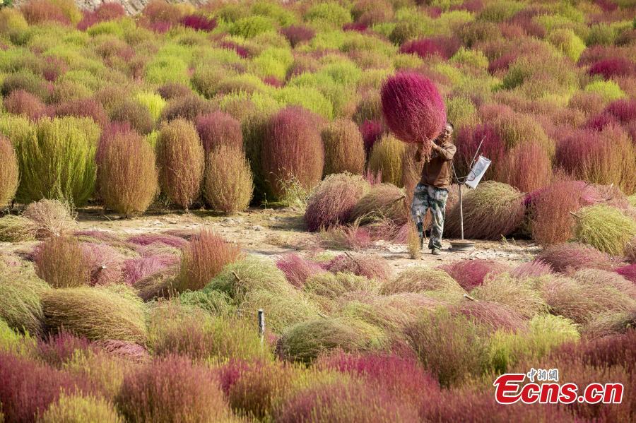 Farmers are busy harvesting the Kochia scoparia, or red broom grass, in Caojiagou village of Liulin county, north China's Shanxi Province. The broom grass turns to bright red color in autumn and can be used to make brooms after it is dried. (Photo: China News Service/Wang Fengyun)
