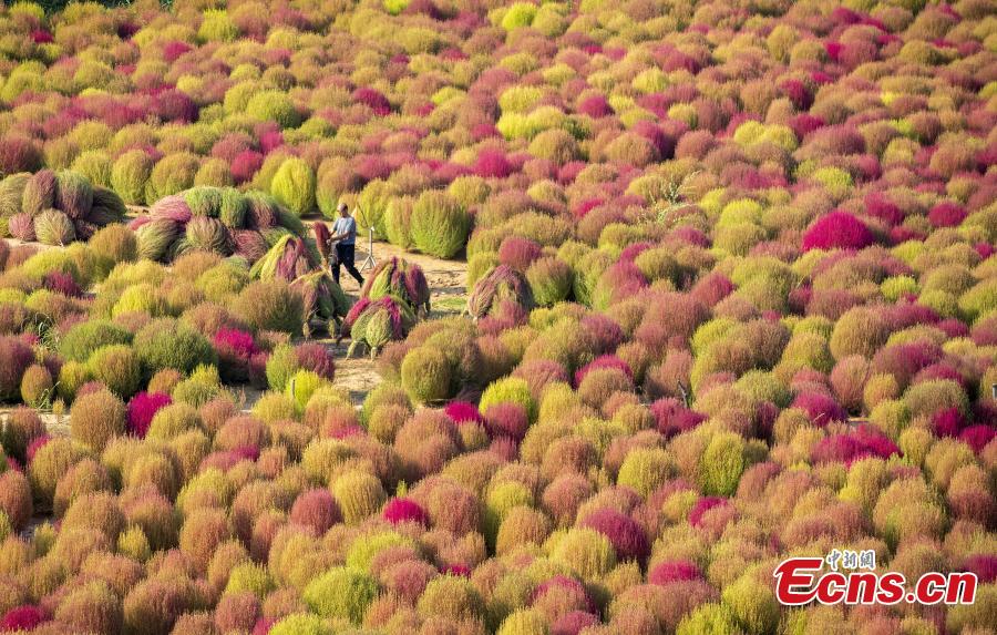 Farmers are busy harvesting the Kochia scoparia, or red broom grass, in Caojiagou village of Liulin county, north China's Shanxi Province. The broom grass turns to bright red color in autumn and can be used to make brooms after it is dried. (Photo: China News Service/Wang Fengyun)