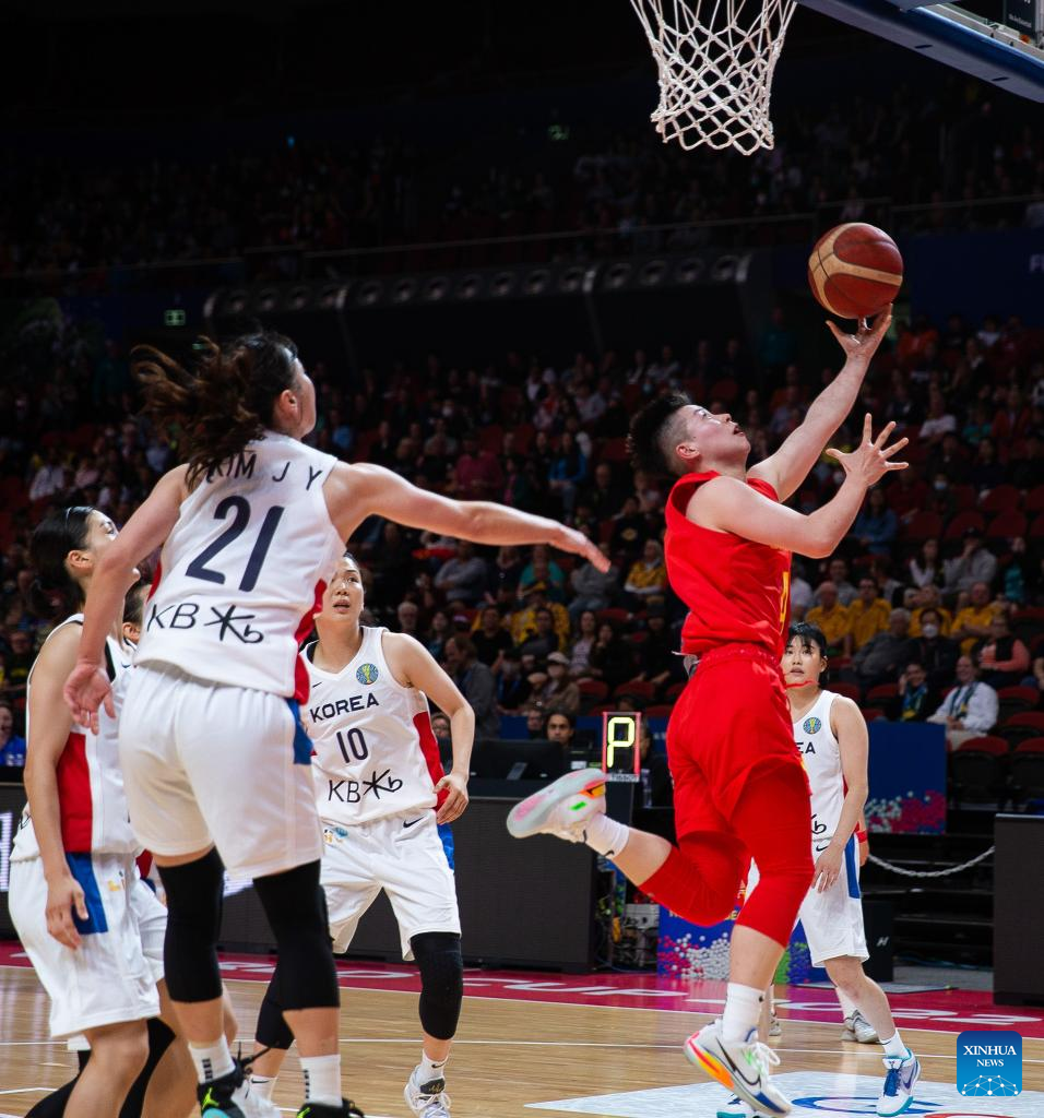Li Yuan (R) of China goes for a lay-up during a Group A match between China and South Korea at the Women's Basketball World Cup 2022 in Sydney, Australia, Sept. 22, 2022. (Photo by Hu Jingchen/Xinhua)