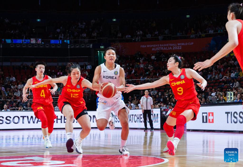 Pan Zhenqi (2nd L) and Li Meng (2nd R) of China vie for the ball during a Group A match between China and South Korea at the Women's Basketball World Cup 2022 in Sydney, Australia, Sept. 22, 2022. (Photo by Hu Jingchen/Xinhua)
