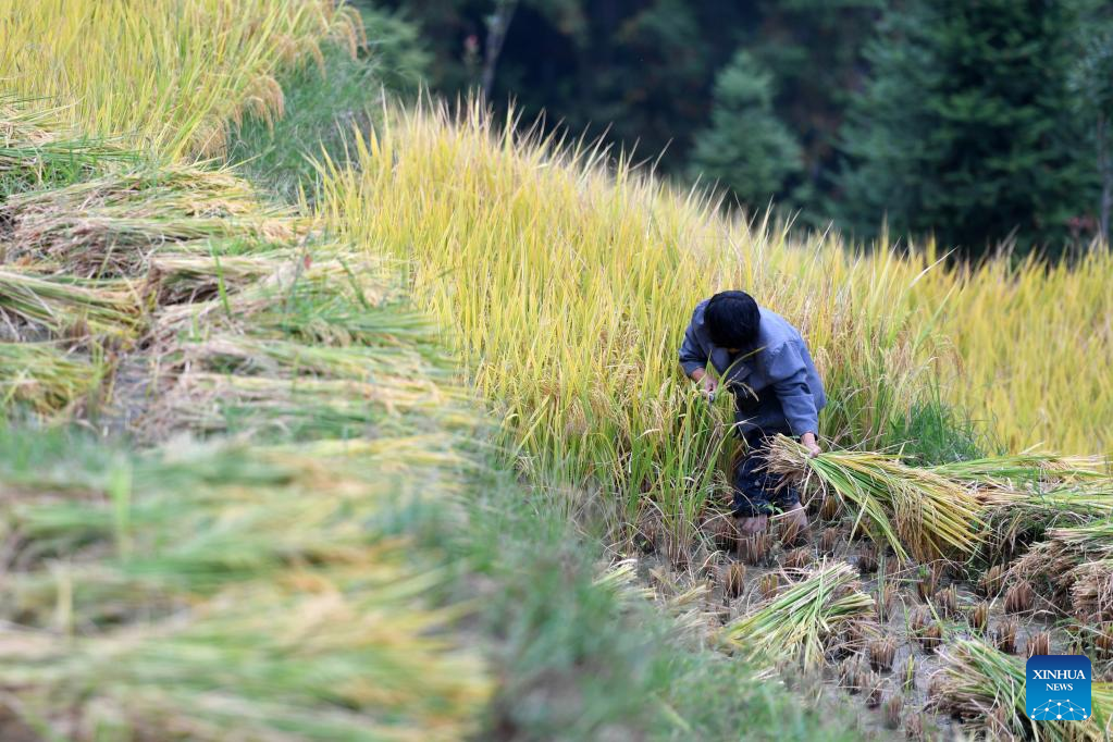 Photo taken on Sept. 22, 2022 shows a farmer working in Ziquejie Terraces in Xinhua County, central China's Hunan Province. (Xinhua/Chen Zhenhai)