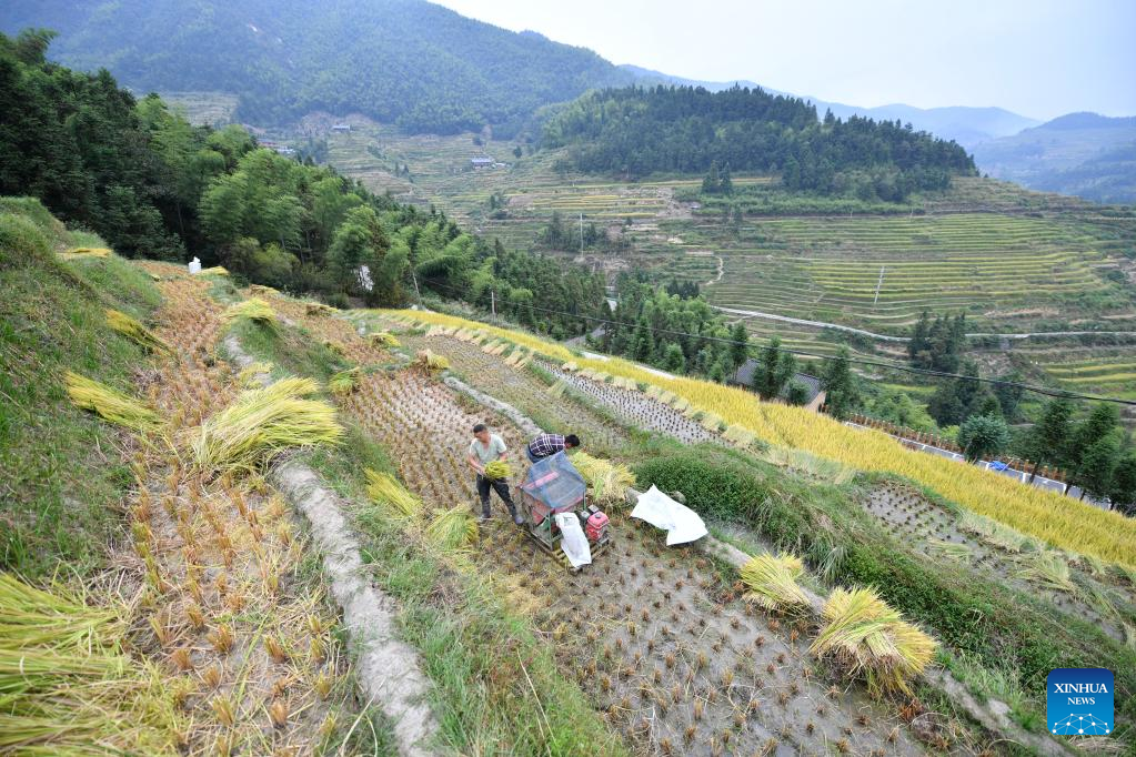 Photo taken on Sept. 22, 2022 shows farmers working in Ziquejie Terraces in Xinhua County, central China's Hunan Province. (Xinhua/Chen Zhenhai)