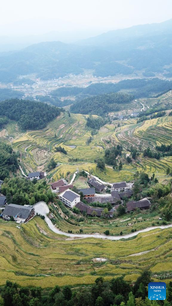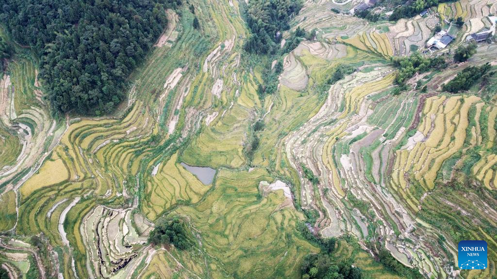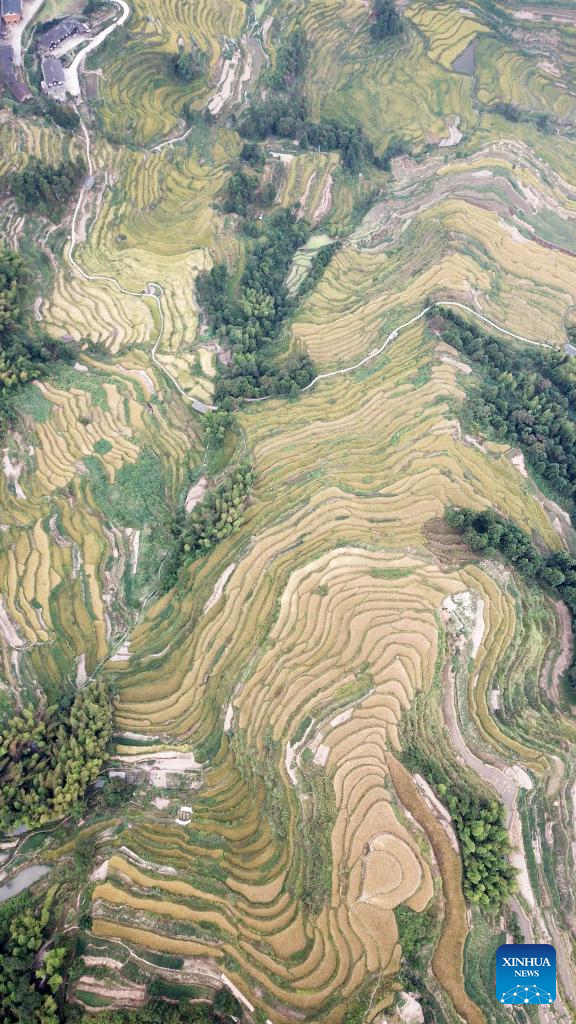 Aerial photo taken on Sept. 22, 2022 shows Ziquejie Terraces in Xinhua County, central China's Hunan Province. (Xinhua/Chen Zhenhai)