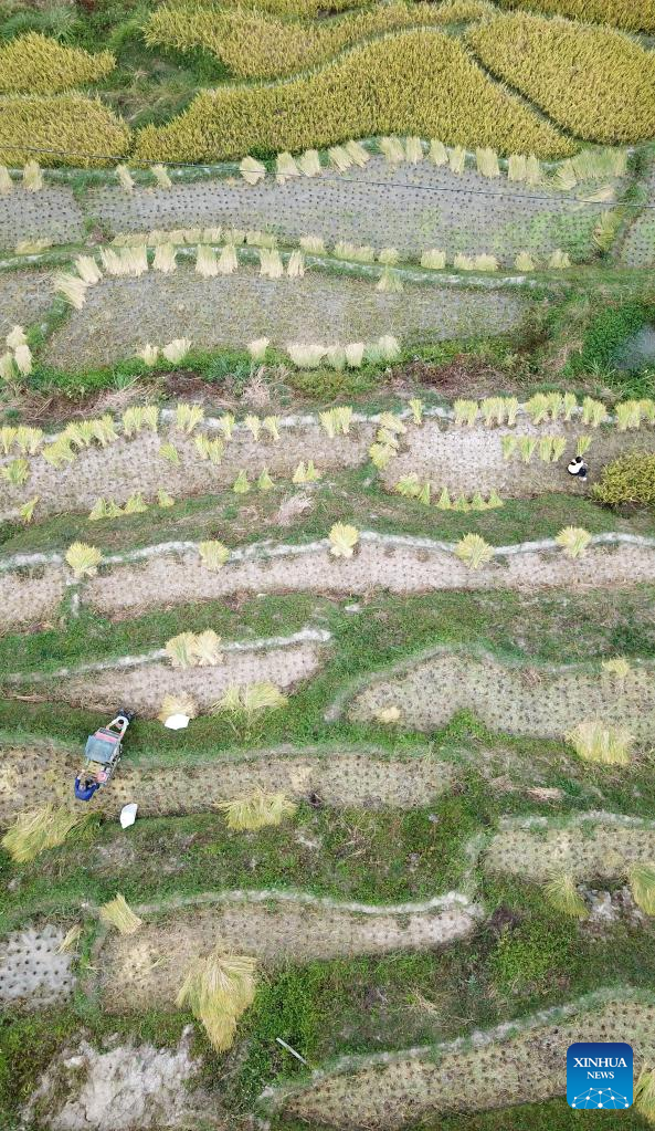 Aerial photo taken on Sept. 22, 2022 shows farmers working in Ziquejie Terraces in Xinhua County, central China's Hunan Province. (Xinhua/Chen Zhenhai)
