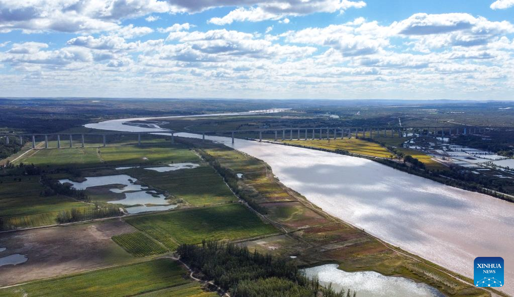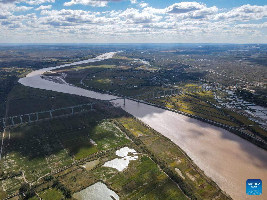 Aerial photo taken on Sept. 22, 2022 shows the scenery along a section of the Yellow River in Togtoh County of Hohhot, north China's Inner Mongolia Autonomous Region. (Xinhua/Bei He)