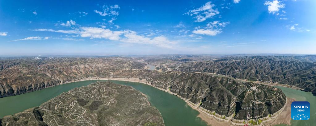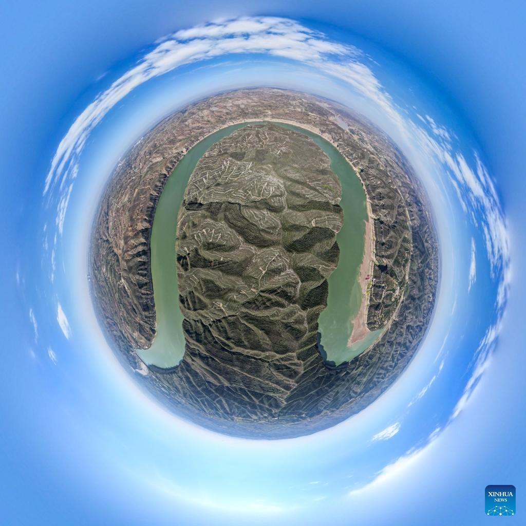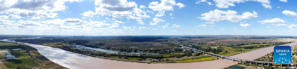 Aerial panoramic photo taken on Sept. 22, 2022 shows the scenery along a section of the Yellow River in Togtoh County of Hohhot, north China's Inner Mongolia Autonomous Region. (Xinhua/Bei He)