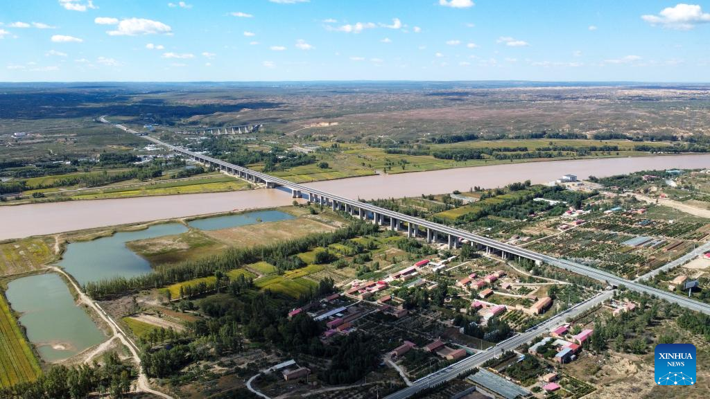 Aerial photo taken on Sept. 22, 2022 shows a grand bridge across a section of the Yellow River in Togtoh County of Hohhot, north China's Inner Mongolia Autonomous Region. (Xinhua/Bei He)