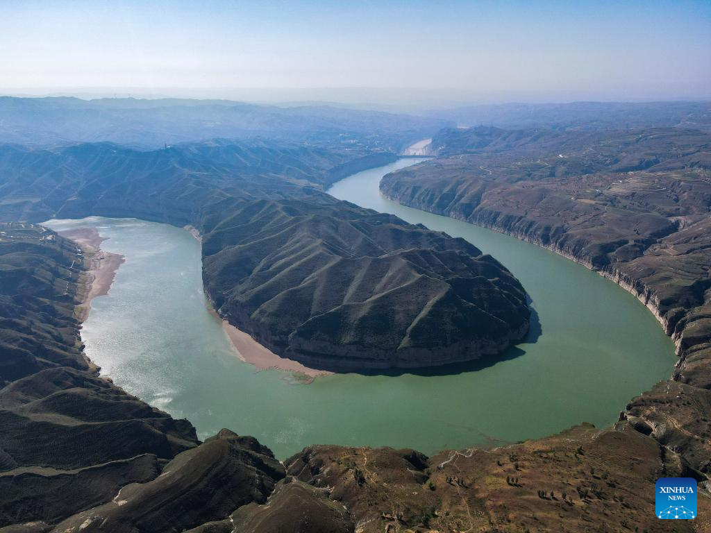 Aerial photo taken on Sept. 21, 2022 shows the scenery along a section of the Yellow River in Jungar Banner of Ordos, north China's Inner Mongolia Autonomous Region. (Xinhua/Bei He)