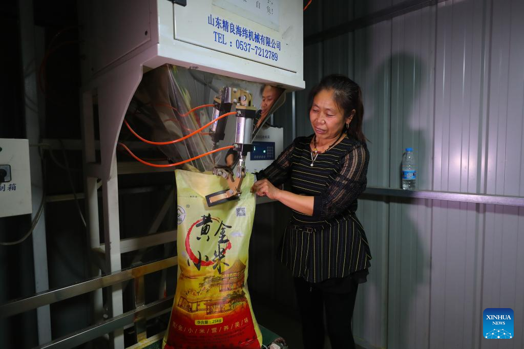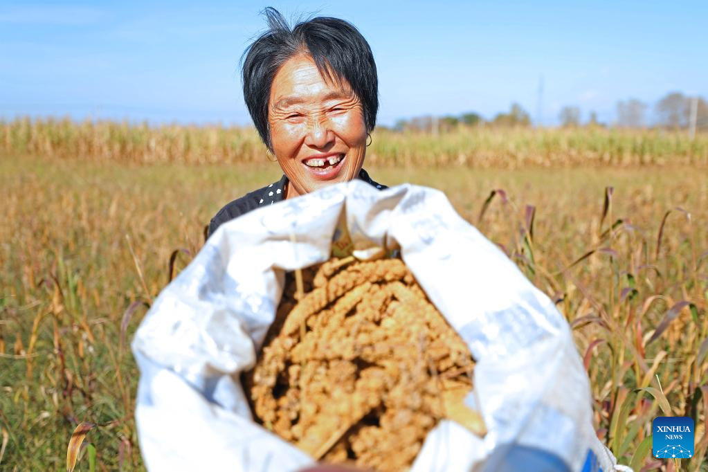 A farmer fills a bag with millet through a machine in Fangjiatun Town, Kangping County, Shenyang City, northeast China's Liaoning Province, Sept. 21, 2022. Kangping County has witnessed bumper harvests of its landmark products millet, apple and sweet potato, with planting areas of 5,000 mu (about 333 hectares) , 35,000 mu (about 2,333 hectares) and 20,000 mu (about 1,333 hectares) respectively. (Xinhua/Yang Qing)