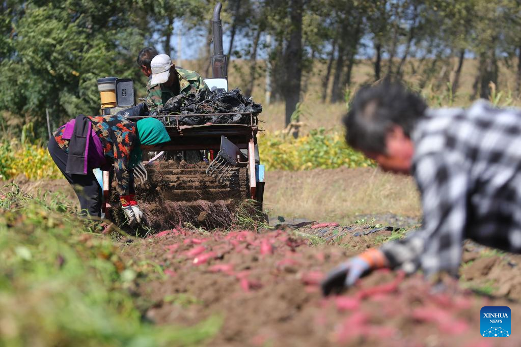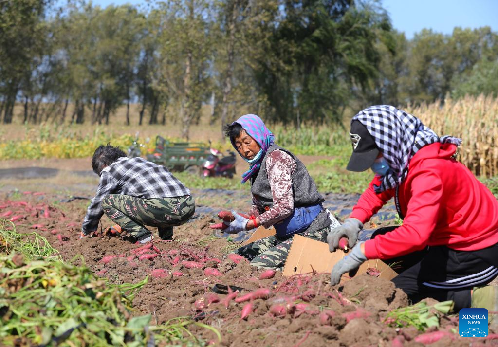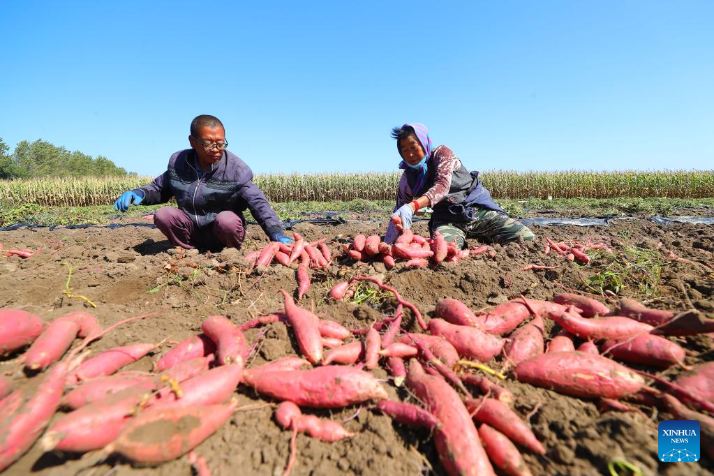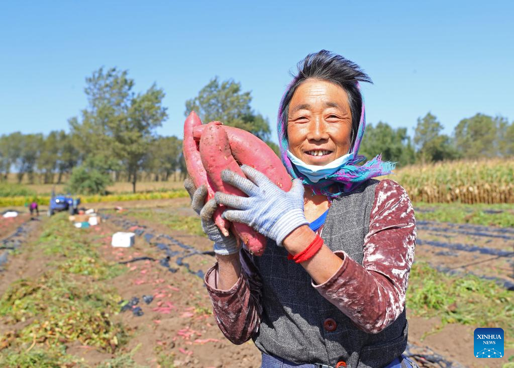 Farmers harvest sweet potatoes in Fangjiatun Town, Kangping County, Shenyang City, northeast China's Liaoning Province, Sept. 21, 2022. Kangping County has witnessed bumper harvests of its landmark products millet, apple and sweet potato, with planting areas of 5,000 mu (about 333 hectares) , 35,000 mu (about 2,333 hectares) and 20,000 mu (about 1,333 hectares) respectively. (Xinhua/Yang Qing)