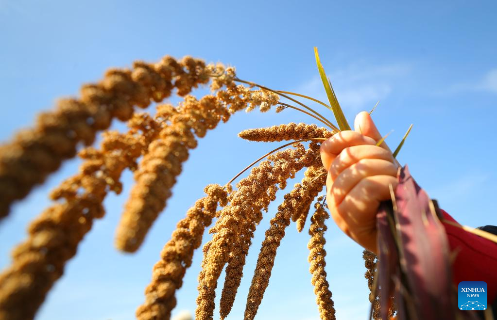 A farmer displays grain in Fangjiatun Town, Kangping County, Shenyang City, northeast China's Liaoning Province, Sept. 21, 2022. Kangping County has witnessed bumper harvests of its landmark products millet, apple and sweet potato, with planting areas of 5,000 mu (about 333 hectares) , 35,000 mu (about 2,333 hectares) and 20,000 mu (about 1,333 hectares) respectively. (Xinhua/Yang Qing)